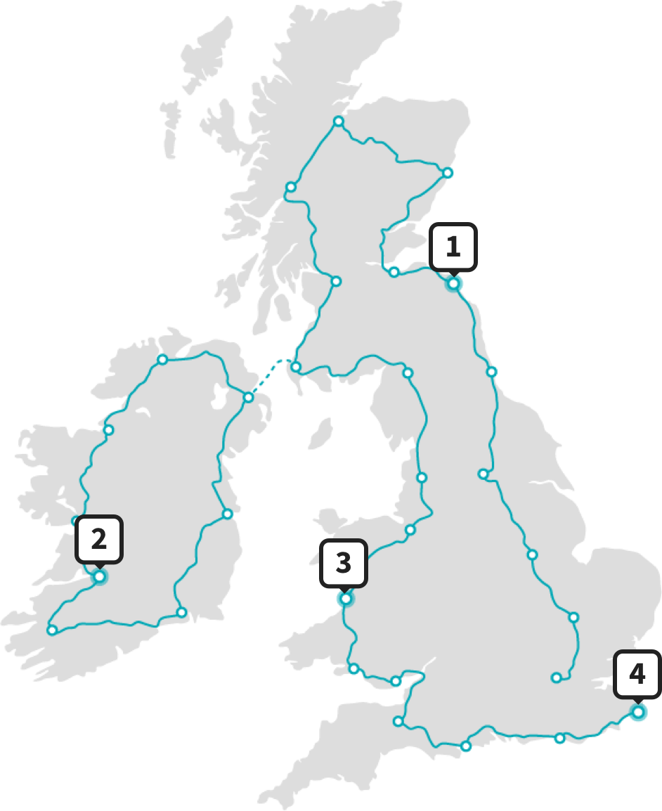 Originally part of our Run around Europe Map, Run UK & Ireland was split in mid 2019. No, it wasn’t part of Brexit, it was to make the Run the world journey more available to everyone. Upload your structured runs and walks to our App and we will track you on an educational, interactive and engaging journey. Our smallest map at 3,890kms, the challenge is on to finish this map the quickest. Covering England, Ireland, Scotland, Northern Ireland and Wales, one must pass through 31 towns and cities to arrive at the finish line in Dover.